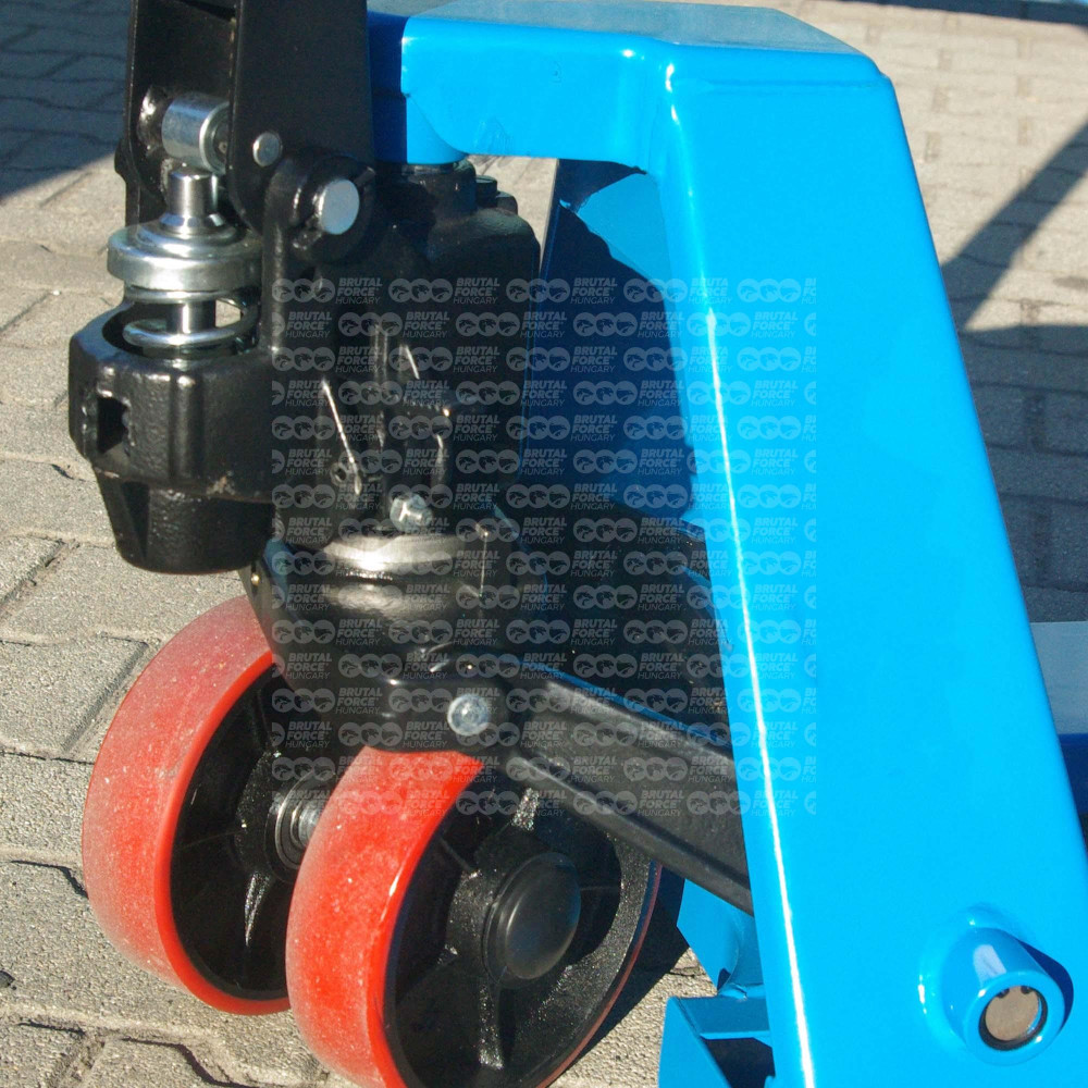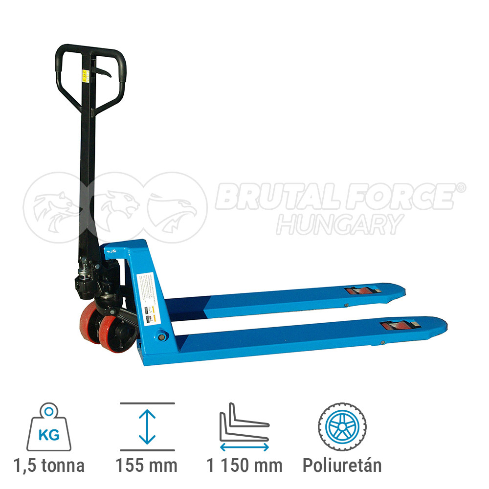 Raklapos áruk szállítására kifejlesztett, 1,5 tonna teherbírású, könnyen kezelhető, nagyon fordulékony kézi raklapemelő eszköz. A süllyesztési sebesség tetszés szerint szabályozható, a három állású vezérlőkarral minden funkció pontosan kezelhető. A súlyleengedés kézzel és lábbal is megoldható. Jó minőségű, extra méretű (20 cm átmérőjű) poliuretán kormányzott kerekekkel, dupla poliuretán burkolatú villagörgőkkel erősített nikkelezett hidraulikával és 3 pontos zsírzási lehetőséggel a hosszabb élettartam érdekében.