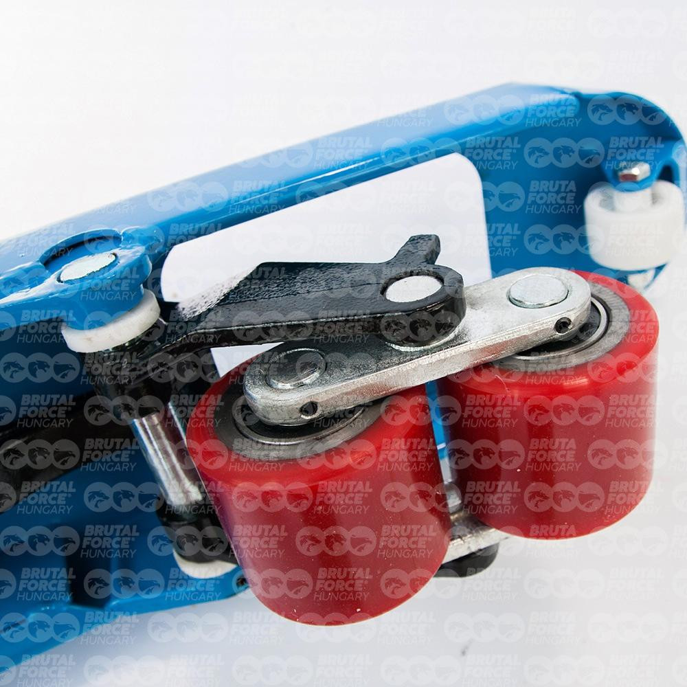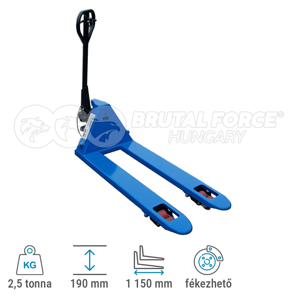 Raklapos áruk szállítására kifejlesztett, 2,5 tonna teherbírású, könnyen kezelhető, nagyon fordulékony, kézi raklapemelő eszköz. A süllyesztési sebesség tetszés szerint szabályozható, a három állású vezérlőkarral minden funkció pontosan kezelhető. A súlyleengedés kézzel és lábbal is megoldható. Jó minőségű, extra méretű (20 cm átmérőjű) poliuretán kormányzott kerekekkel, dupla poliuretán burkolatú villagörgőkkel erősített nikkelezett hidraulikával és 3 pontos zsírzási lehetőséggel a hosszabb élettartam érdekében.