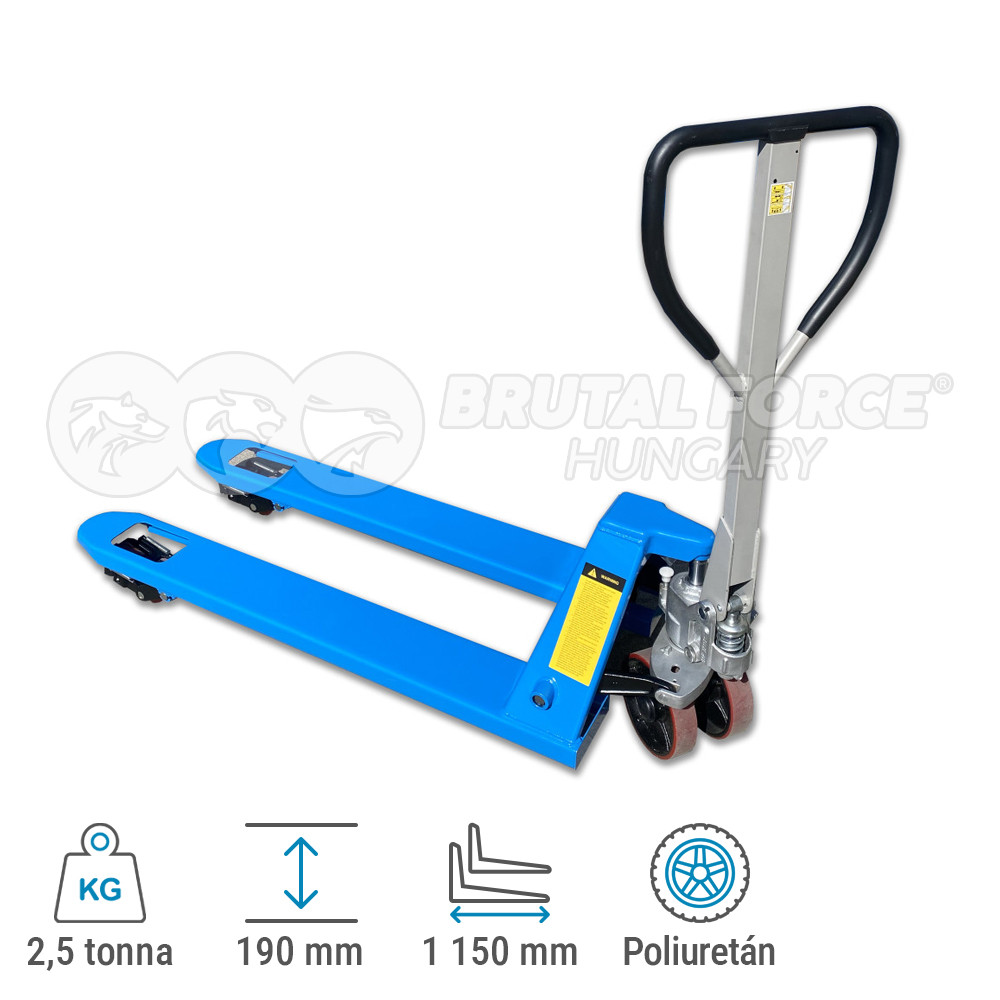 Extra hatékonyság, az oldalirányú mozgásra alkalmas, 4 irányú kialakítású béka segítségével! Rugalmasabb anyagmozgatási feladatok, nagyobb segítség a mindennapokhoz: ezt kínáljuk a Brutal Force-nál! A raklapos áruk szállítására kifejlesztett, 2,5 tonna teherbírású, könnyen kezelhető, nagyon fordulékony, kézi raklapemelő eszköz most mérleggel érkezik!!! A süllyesztési sebesség tetszés szerint szabályozható, a három állású vezérlőkarral minden funkció pontosan kezelhető. A súlyleengedés kézzel és lábbal is megoldható. Jó minőségű, extra méretű (20 cm átmérőjű) poliuretán kormányzott kerekekkel, dupla poliuretán burkolatú villagörgőkkel erősített nikkelezett hidraulikával és 3 pontos zsírzási lehetőséggel a hosszabb élettartam érdekében.